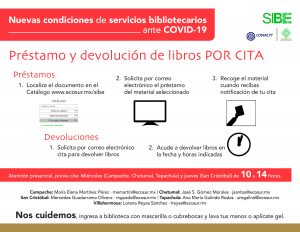 En el marco de las nuevas condiciones de los servicios bibliotecarios ante COVID-19, el préstamo y devolución de libros se realizará con previa CITA. El personal bibliotecario de cada Unidad acudirá una vez por semana para atender las solicitudes emitidas por correo electrónico.
