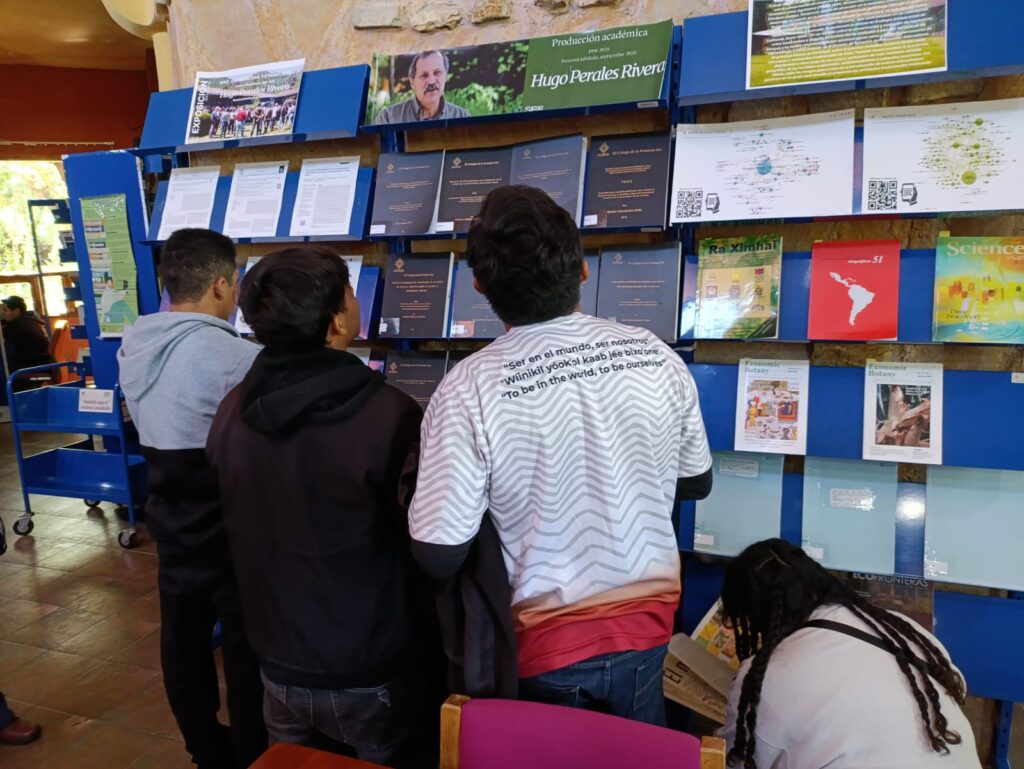Como parte de un viaje de estudios en el que recorrieron la Península de Yucatán y el Estado de Chiapas, el lunes 1 de diciembre, un grupo de la carrera de Ingeniería en Sistemas de producción Agroecológicos de la UIMQROO visitó ECOSUR y en particular se interesó en conocer qué información acerca de agroecología podemos brindarles. Las exposiciones de tesis del Posgrado y de la producción académica de Hugo Perales les llamaron mucho la atención, en especial las tesis de la Maestría en Agroecología.
