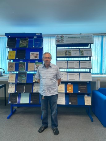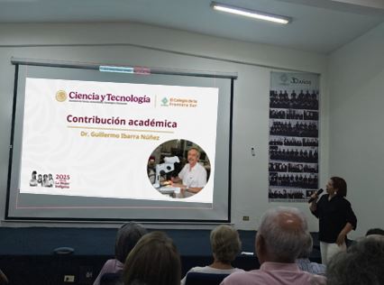 Durante el evento, Ana María Galindo Rodas, responsable de la biblioteca del SIBE en la Unidad Tapachula, tuvo una participación al presentar una semblanza del legado académico del Dr. Ibarra. En su intervención, resaltó la amplitud y relevancia de sus contribuciones, entre ellas su producción científica, la formación de nuevas generaciones de especialistas, la descripción de diversas especies de arañas y su constante participación en congresos y procesos de revisión de manuscritos. Su participación aportó un valioso contexto bibliográfico e histórico que subrayó la importancia del homenajeado dentro de la aracnología mexicana.