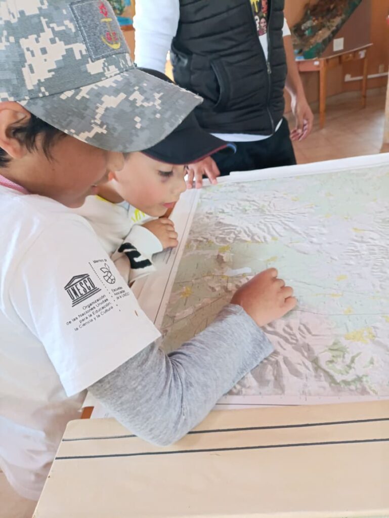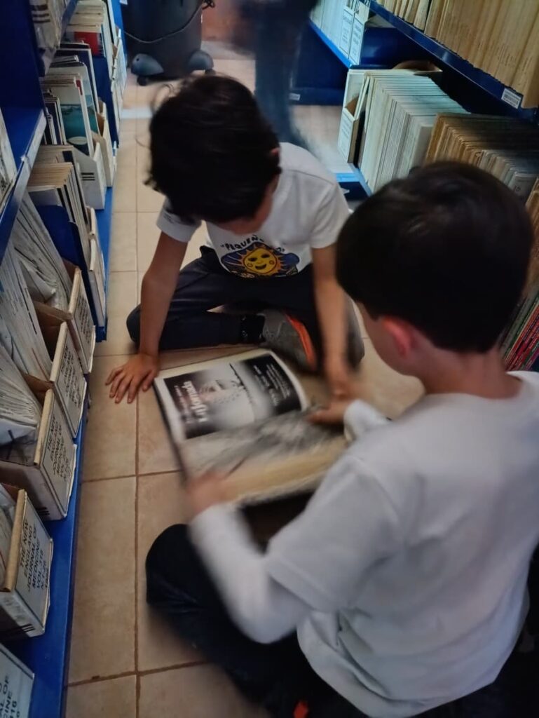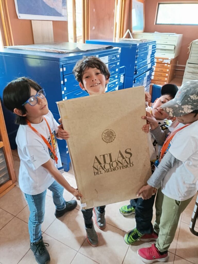 Tenían curiosidad por conocer la planta alta así que nos enfilamos para subir a la mapoteca y hemeroteca. Allí desbordaron su curiosidad observando mapas y atlas que sacamos de las gavetas. Antes de despedirse, Ema, pegada a un anaquel de revistas nos dijo con los ojos cerrados que amaba los libros, que le encantaba su olor y que quería quedarse a leer. Otro niño encontró el libro más pesado de la biblioteca, el Atlas Nacional del Medio Físico, tan pesado que necesitó ayuda de sus compañeros para cargarlo, pidió que le tomáramos una foto. Finalmente salieron contentos y contentas de regreso a su escuela.