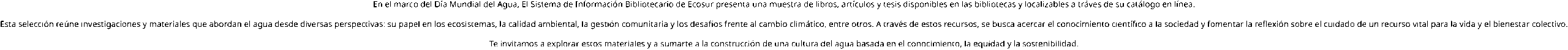 En el marco del Día Mundial del Agua, El Sistema de Información Bibliotecario de Ecosur presenta una muestra de libros, artículos y tesis disponibles en las bibliotecas y localizables a tráves de su catálogo en línea. Esta selección reúne investigaciones y materiales que abordan el agua desde diversas perspectivas: su papel en los ecosistemas, la […]